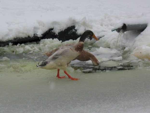 Aus diesem Grund hatten wir im Herbst 2012 bereits für den eisigen ‚Notfall‘ vorgedacht und uns vorgenommen, sie ggf. in den gemauerten Raum unterhalb einer unserer beiden Garagen unterzubringen. Wir haben aber feststellen müssen, dass die Kältegrenze unserer Laufenten (zumindest Daisy ist eine Sachsen-Ente) schon bei etwa minus 5° C erreicht war: Während sie sonst ständig im Wasser oder zu Fuß unterwegs waren, hockten sie nun nur noch ganz still unter einem Busch. Als wir sie dann einmal gerufen hatten, kamen sie ganz schnell zu uns, aber Donald war am Humpeln. Die Patscher taten ihm offensichtlich vor Kälte weh.